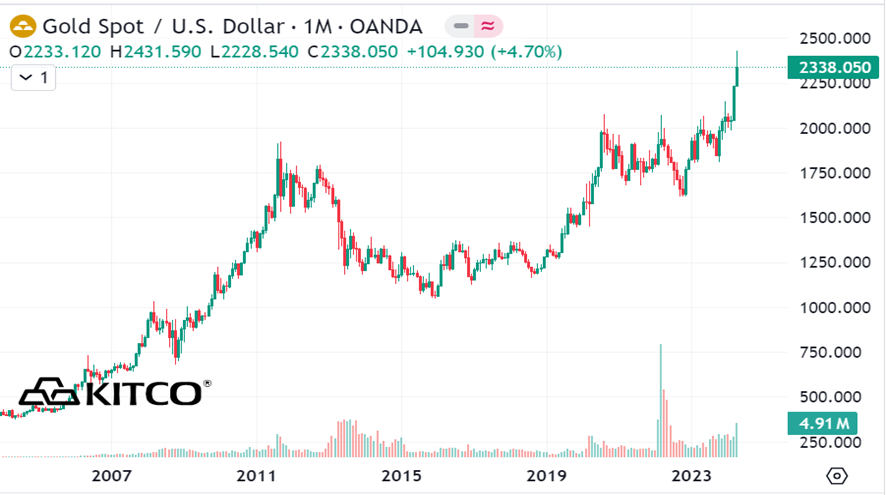 Gold has given a CAGR of 11.2 % in last 20 years from beginning from Apr-2004 to Apr-2024. On 01-Apr-2004, Gold was $442 an ounce and today it is $2338 an ounce. Below is a chart showing the price rise.